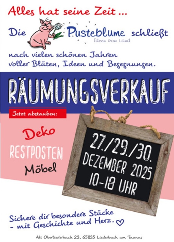 Jetzt schonmal ein Hinweis auf den Räumungsverkauf der Pusteblume in Liederbach. Deko, Restposten und Möbel. Bitte beachten: Erst ab 27.12.2025.