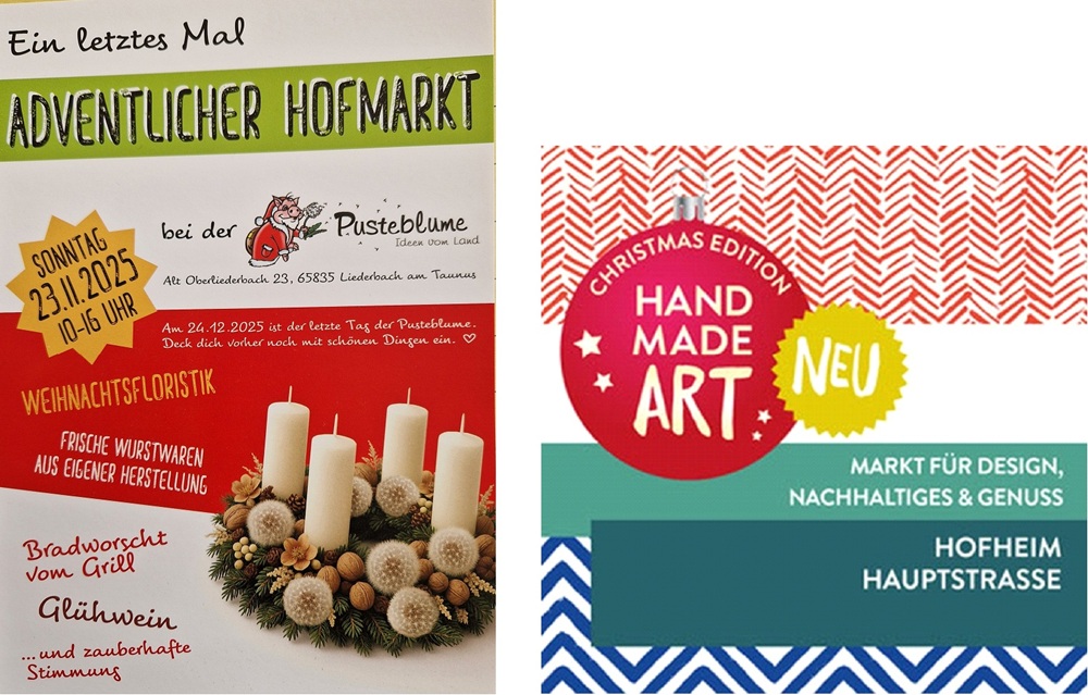 Es geht ja schon schwer auf Weihnachten zu. Oft geht das ja schneller als man glaubt. Auf jeden Fall finden Sie hier außergewöhnliche Geschenke, für einen lieben Mitmenschen oder sich selbst. Beim Bummeln und genießen werden Sie unvergessliche, schöne Stunden verbringen. Auf beiden Veranstaltungen bin ich mit einem Stand dabei.